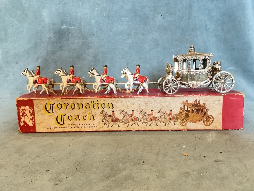 A boxed Lesney handpainted diecast model of the golden state coach with four pairs of grey horses with postillions, produced for the 1953 coronation. (15.5in)