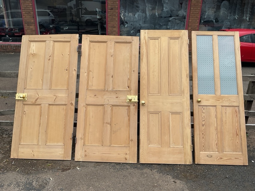 A pair of Victorian stripped pine four-panel doors with brass knobs and rimlocks - 34in x 72in; a similar door with brass knobs - 28in x 76in; and another with frosted glass panels, brass knobs and steel rimlock. (4)