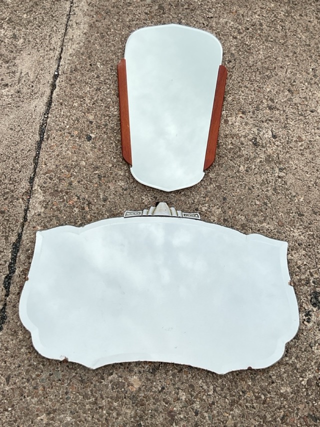 A 60s tapering shield shaped bevelled mirror in mahogany frame - 22.25in; and a shaped 50s frameless bevelled mirror with chrome mount - 27in. (2)
