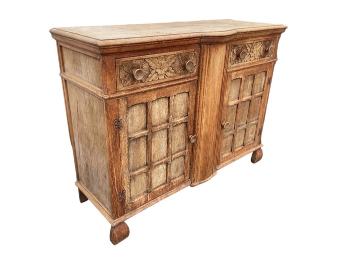 A 50s oak sideboard with bowfronted central panel framed by foliate carved knobbed drawers and chamfered eight panelled doors, raised on shaped spade feet. (50in x 19in x 38in)