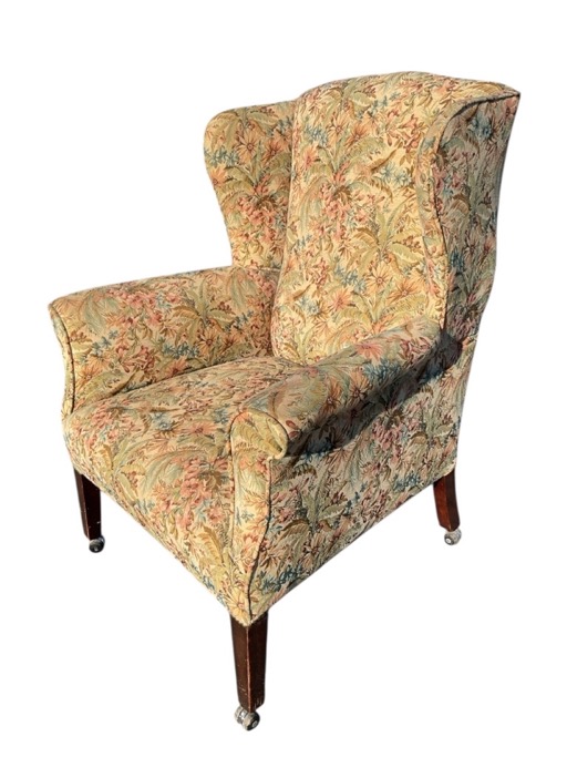 An Edwardian upholstered wing armchair with arched back and rectangular seat flanked by curved wings and outscrolled arms, raised on tapering square legs with castors.