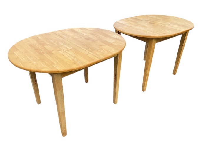 A pair of modern ramin tables with integral extending leaves, the rectangular rounded tops supported on square tapering legs. (39in x 30in x 29.75in) (2)