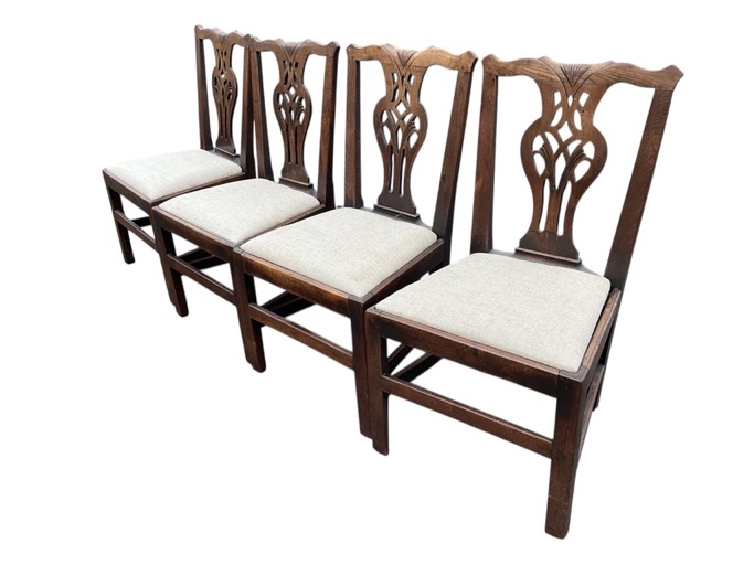 A set of four eighteenth century laburnum Chippendale style chairs with shaped carved pierced splats beneath shell carved rails, above drop-in newly reupholstered Ralph Lauren linen seats, raised on square chamfered legs joined by stretchers. (4)