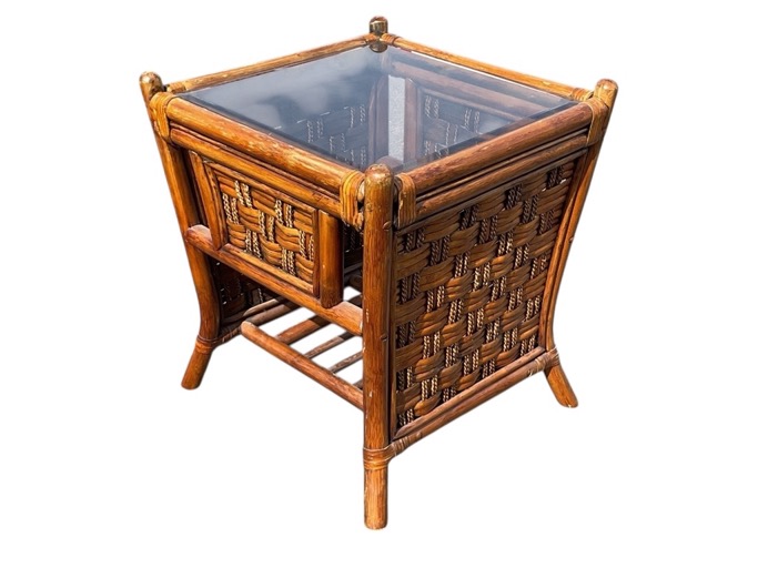 A cane coffee table with square bevelled glass top above woven cane and seagrass panels on splayed cylindrical legs joined by a slatted undershelf. (21in x 21in x 23.5in)