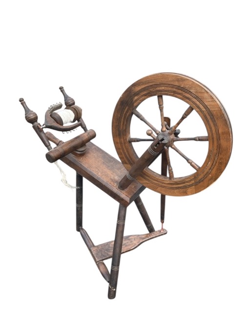 A beech Saxony style spinning wheel with angled platform supporting spindled wheel and bobbin mounts, with treadle mechanism below. (29in x 16in x 32in)