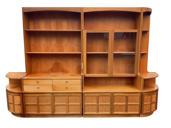 A Nathan teak modular wall unit comprising a bowfronted corner cupboard, a straight fronted dresser with shelves and drawers above cupboards, another with shelves and glazed cabinet above cupboards, and a bowfronted section with shelves over a cupboard. (116in x 18in x 76.75in) (4)