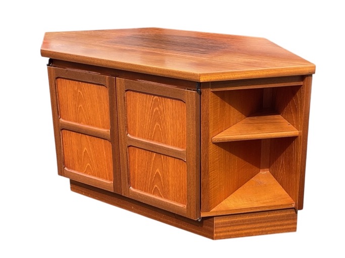A Nathan teak corner unit with hexagonal top above a pair of panelled doors flanked by angled open shelves. (39in x 19in x 20.5in)