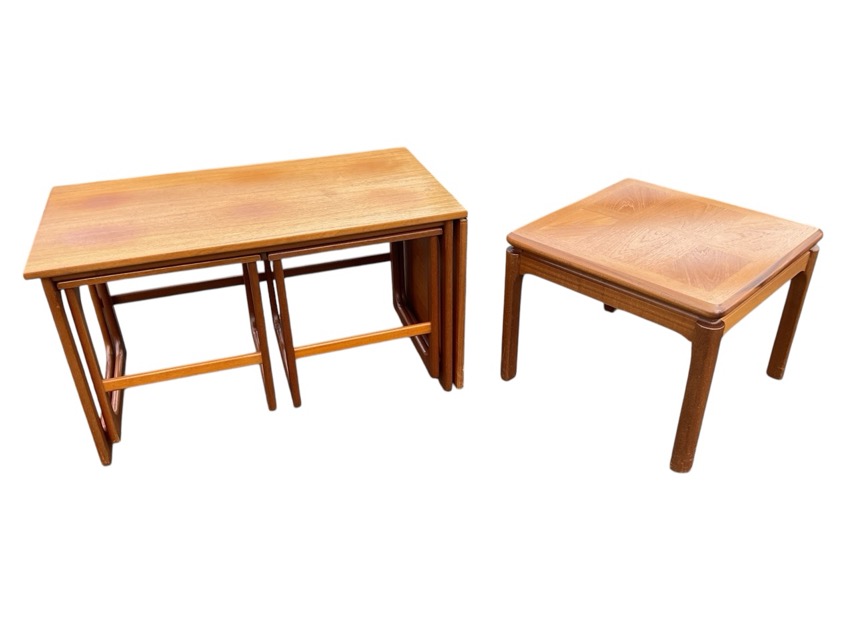 A 70s McIntosh teak nest of three tables on frame legs, the larger with sliding top and hinged leaf; and a Nathan square teak coffee table raised on chamfered cylindrical legs. (2)