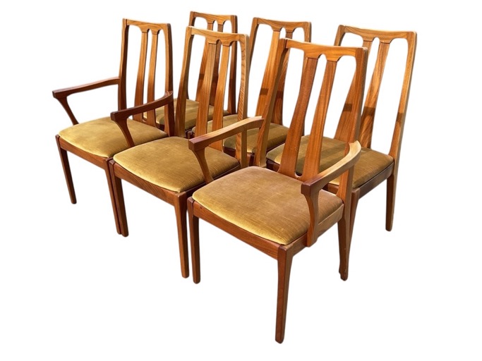 A set of six Nathan teak dining chairs including two carvers with tapering slatted backs above upholstered seats raised on tapering square legs, the carvers with curved arms on conforming supports. (6)
