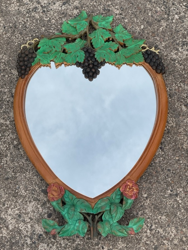 A heart shaped carved mirror, the moulded frame having painted grapevine crest and apron. (33in x 22in)