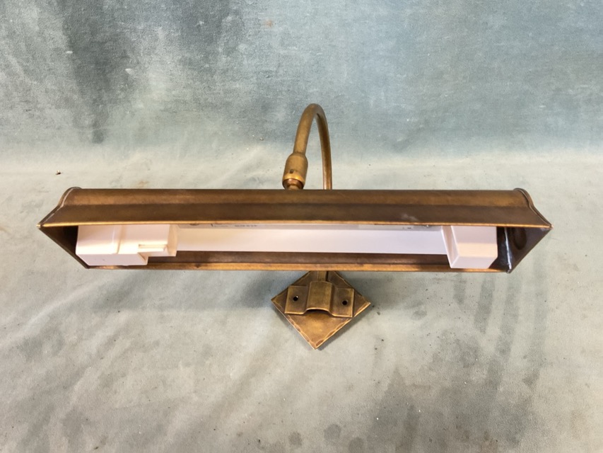 A Jim Lawrence brass picture light with square wall-plate and arched bracket supporting rectangular hooded shade. (12in)