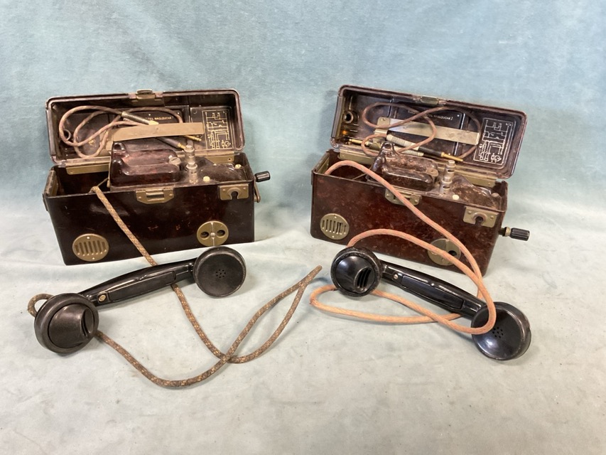 A pair of Czechoslovakian WWII field telephones in rectangular bakelite cases having crank generator handles. (10.5in) (2)