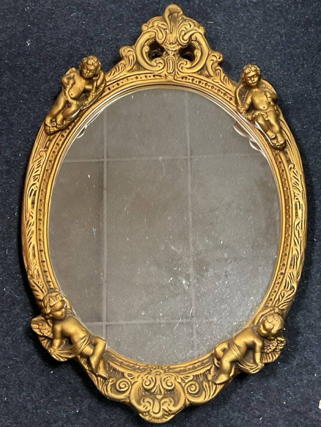 An oval mirror in gilt plaster foliate moulded frame mounted with winged cherubs, the crest with pierced scrolls. (16.5in x 24.75in)