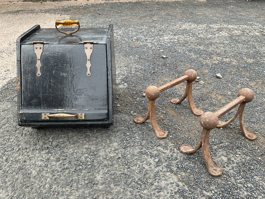 An Edwardian painted coal box with amber glass brass handle, the slope front with strap hinges; and a pair of Edwardian art nouveau fire dogs with stylised splayed foliate feet and ball finials. (3)