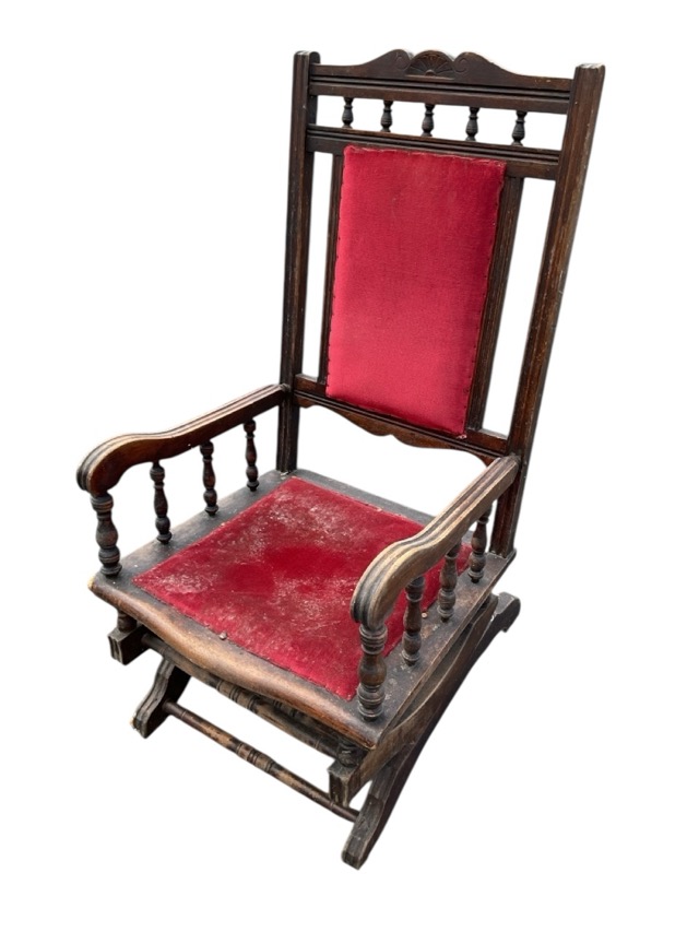 An Edwardian hardwood rocking chair with shell carved spindled crestrail and padded back and seat flanked by moulded scrolled arms on spindle supports, on a sprung rocker base with shaped feet joined by turned stretchers.