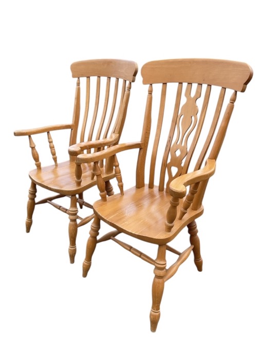 A Victorian style beech farmhouse armchair with curved back and pierced splat flanked by slats above a solid seat framed by serpentine shaped arms on spindle supports, raised on turned legs; and another similar with slatted back. (2)