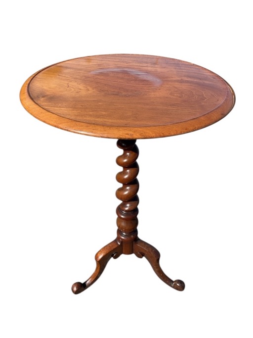 A Victorian walnut wine table with circular top on a barleytwist tapering column raised on a tripod base with scrolled legs. (19in x 19in x 29.5in)