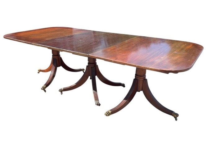 An Edwardian regency style three-pedestal mahogany dining table with rounded rectangular top on barrel-turned columns the end sections raised on tripod bases with sabre legs and brass lions paw castors, the central section with four legs. (45in x 98in x 29in)