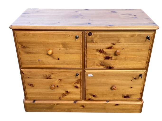 A Victorian style pine filing cabinet with moulded rectangular top above four knobbed file drawers (with keys) raised on a rounded plinth. (39in x 17.5in x 29.5in)