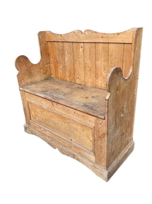A pine settle with cupids bow crestrail and tongue-and-groove back flanked by shaped arms above a hinged seat, with panelled front on a shaped plinth. (37in x 16in x 35.5in)