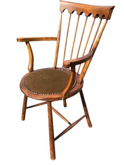 An Edwardian mahogany armchair with curved arcaded crestrail and spindled back above a circular padded brass studded seat, raised on tapering cylindrical legs joined by stretchers.