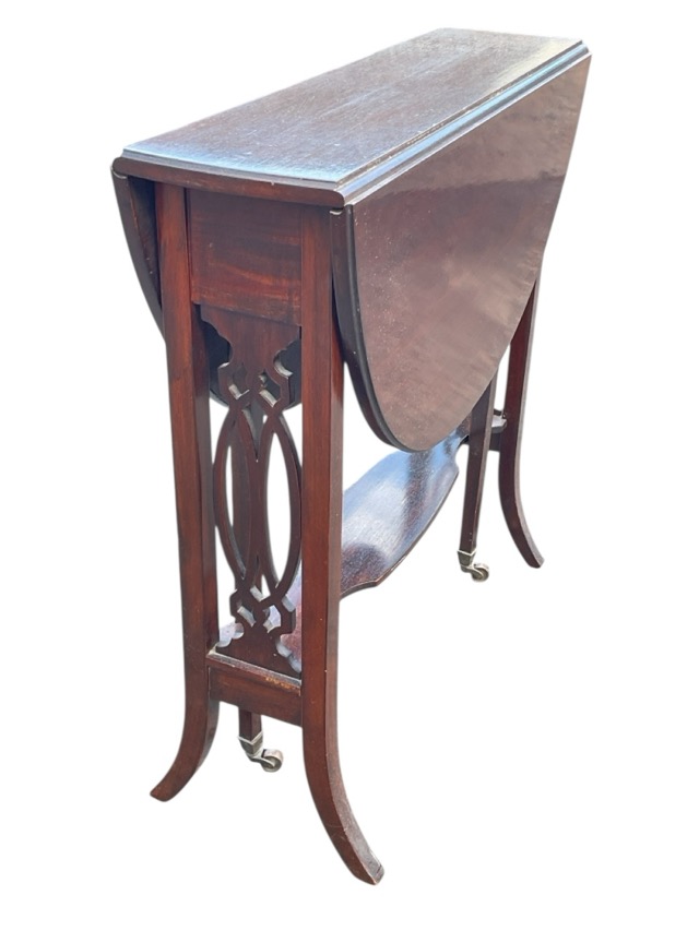 An Edwardian mahogany sutherland table, the oval moulded top with two leaves opening on swing legs with brass castors, above ends with pierced splats joined by shaped stretcher, raised on square tapering outswept feet. (28in x 23.5in x 24in)