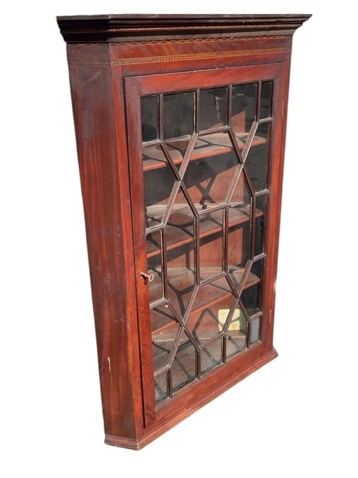 A C19th Georgian mahogany hanging corner cabinet with moulded inlaid cornice above a geometric marquetry banded frieze and astragal glazed door enclosing shelves. (29in x 17in x 43.5in)