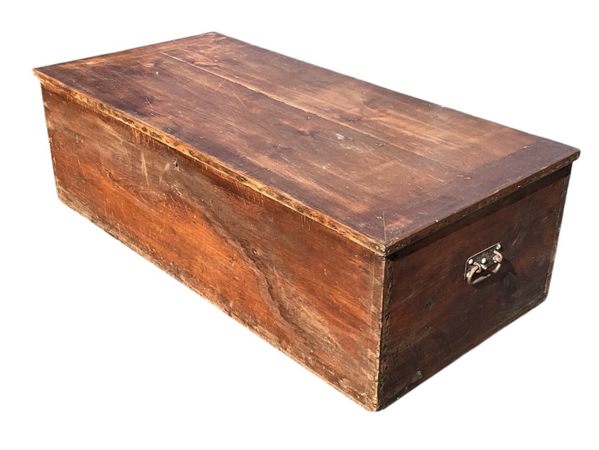 A Victorian pine blanket box of dovetailed construction with hinged rectangular top mounted with iron handles and lock. (48.75in x 23.5in x 15in)