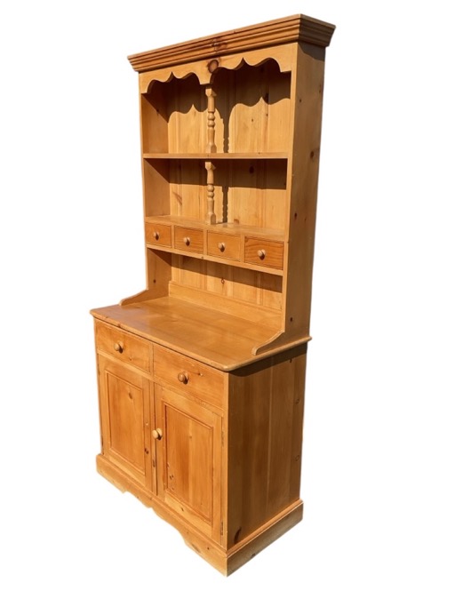 A Victorian style pine dresser with moulded cornice above an ogee arched apron and open shelves, having row of four knobbed drawers below on a base with rectangular top over a pair of knobbed drawers are panelled cupboards, on a shaped plinth. (37in x 18in x 74in)