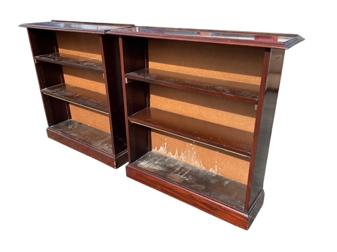 A pair of mahogany bookcases with rectangular moulded tops above open adjustable shelves on moulded plinths. (38in x 11.75in x 37.5in) (2)