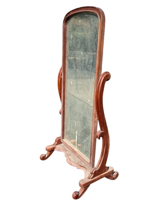 A Victorian mahogany cheval mirror with arched moulded frame and bevelled plate tilting on scrolled supports above a moulded serpentine fronted platform, raised on scrolled feet. (29.5in x 22in x 64in)
