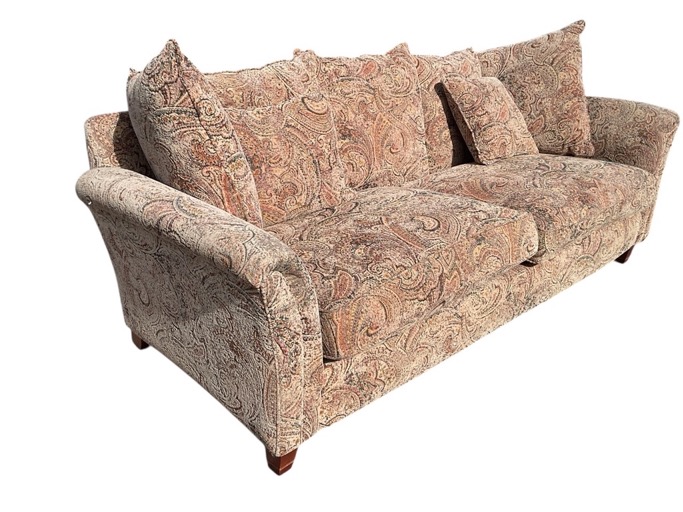 A Parker Knoll three-seater sofa with rectangular back and seat with loose cushions flanked by outscrolled arms covered in paisley chenille fabric, raised on tapering square feet. (88in)