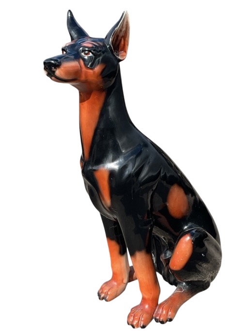 A life-sized ceramic figure of a seated Doberman Pinscher dog with alert expression. (33in)