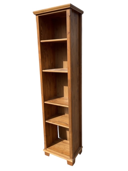 A pine bookcase with moulded cornice above five adjustable shelves, on a moulded base raised on square block feet. (19.5in x 13.5in x 76in)
