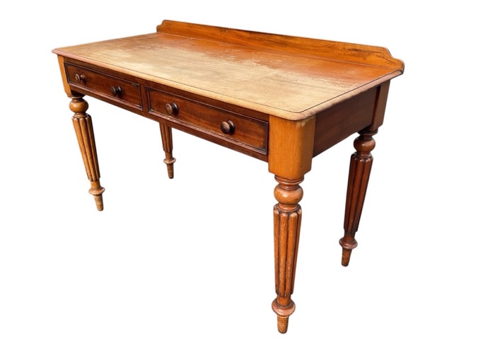 A Victorian mahogany side table with raised back and moulded rectangular top above a pair of knobbed panelled frieze drawers, raised on turned tapering ribbed legs. (47in x 21.5in x 32in)