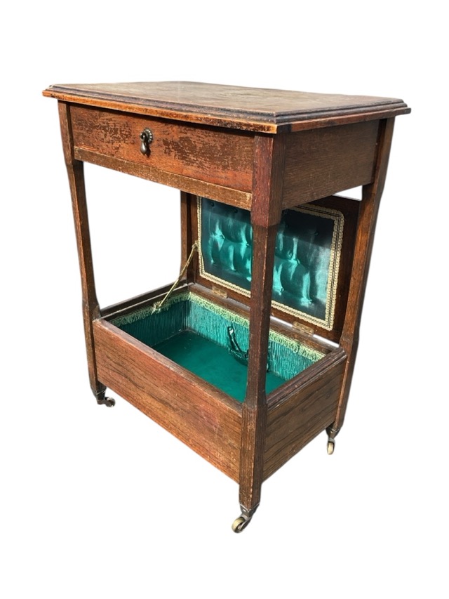 An Edwardian oak sewing table with rectangular moulded top and frieze drawer on square supports above a sewing box with hinged cover enclosing silk lined interior, raised on square feet with brass castors. (20in x 13in x 37in)