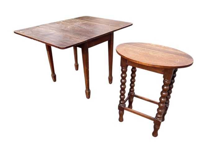 A small Edwardian occasional table with rectangular top and two leaves opening on lopers, raised on tapering square legs with spade toes - 28in x 20.5in x 18.5in; and an small mahogany table with oval top on bobbin turned legs joined by stretchers - 15in x 10in x 18.5in. (2)