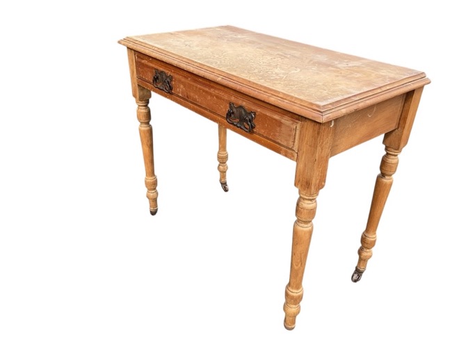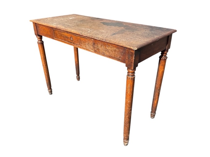 A Victorian oak side table with rectangular top above a plain frieze with cockbeaded drawer, raised on turned tapering polygonal legs with beaded collars. (45in x 19.5in x 30.5in)