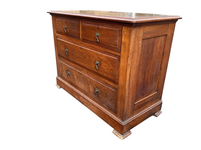 A Victorian walnut chest of drawers with rectangular bevelled top above four gothic brass drop handled drawers on a moulded plinth, raised on moulded block feet. (41.5in x 20.25in x 31.5in)