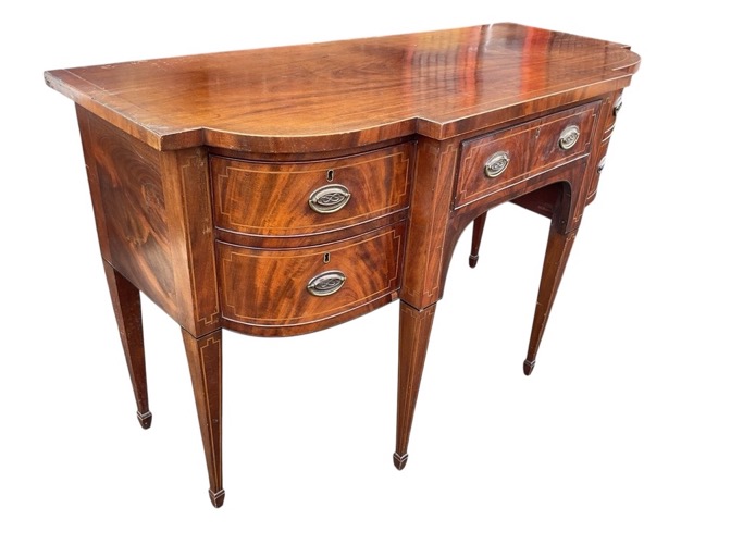 A regency boxwood and ebony strung mahogany breakfront sideboard with shaped top above a central drawer flanked by two bowfronted drawers and a conforming cupboard with dummy drawer fronts, raised on tapering square legs with spade toes. (61in x 26in x 36.5in)