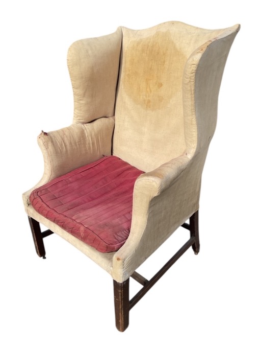 A George III mahogany upholstered wing armchair with camel back and rectangular seat with loose cushion flanked by serpentine shaped wings and outscrolled downswept arms, raised on square chamfered legs with original brass castors joined by stretchers.