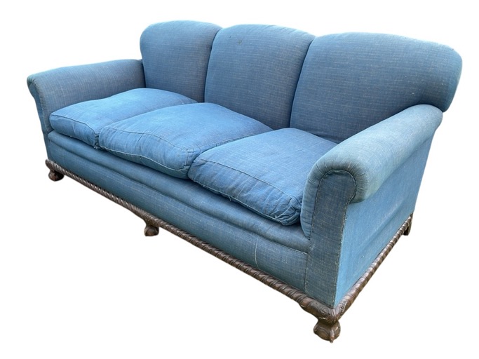 An Edwardian upholstered mahogany drop-end three-seater sofa, with rectangular back and sprung seat with loose cushions, above gadroon carved rails with acanthus knees and ball-and-claw feet. (79in)