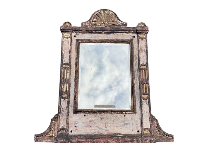 A Victorian cast iron overmantel mirror with arched fan crest above a rectangular bevelled plate flanked by pilasters with conforming fan finials and brackets with butterfly motifs. (35.5in x 33in)