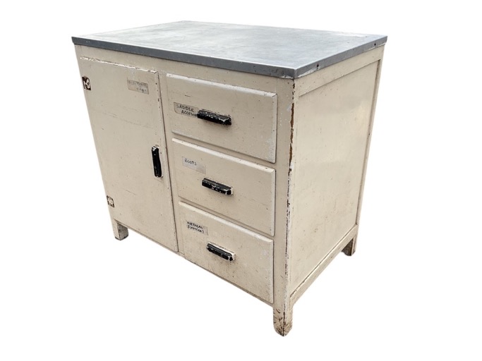 A C20th kitchen cabinet, the rectangular aluminium top above cupboard and three drawers, raised on square legs. (33.25in x 21in x 31.25in)