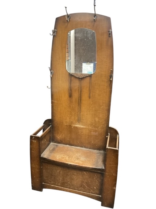 A 30's deco oak hall stand with arched back mounted with copper plated coat hooks framing a shaped mirror over an applied floral motif, above a hinged seat flanked by stick stands. (35.5in x 12.25in x 72in)
