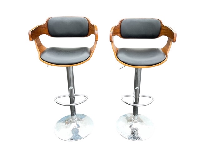 A pair of Eames style faux walnut bar stools with curved padded backs and cushion seats flanked by conforming arms, rotating on chromed rise-and-fall columns with tubular footrests, on flared circular bases. (2)