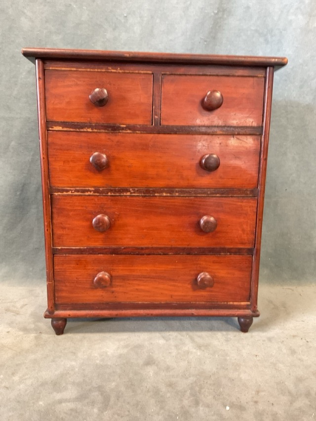 A miniature Victorian mahogany chest of drawers with rectangular top above five knobbed drawers, raised on turned feet. (13.5in x 6.25in x 16in)