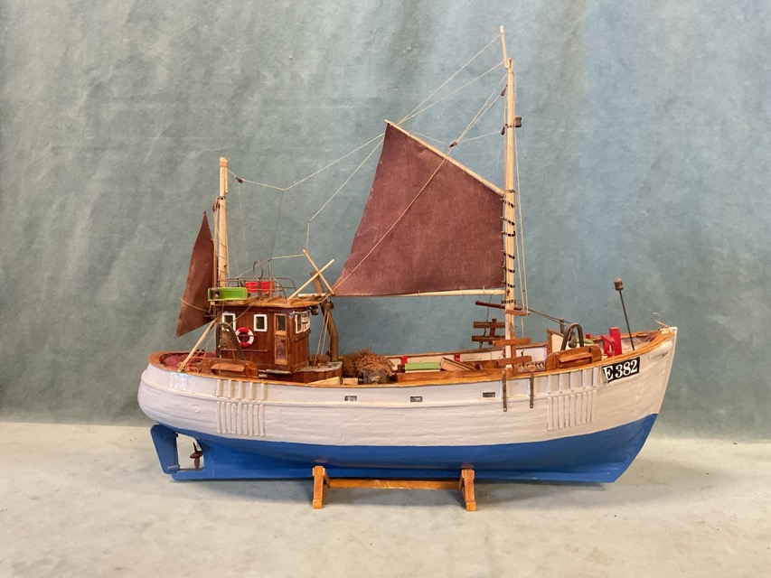A detailed scratch-built two-masted model of a Danish North Sea fishing vessel, clinker built with wheelhouse and fully equipped deck with nets, fish boxes, etc., on a stand. (21in)