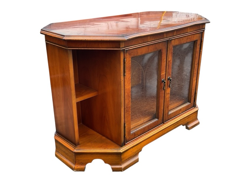 A crossbanded yew cabinet with shaped top above a pair of glazed doors with gothic engraved glass panels, flanked by open angled shelves, on a plinth with flared feet. (37.5in x 19in x 25.5in)