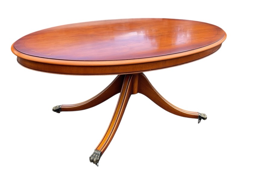 A regency style yew coffee table with oval mahogany strung moulded top on column, raised on grooved sabre legs with brass lions paw castors. (52in x 28in x 21.5in)